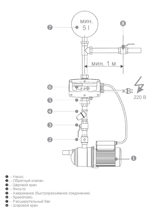Speedmatic Easy защищает насосы по сухому ходу, и предельному току. Устройство монтируется In-line, подключение 1 1/4" н.р., в комплект поставки входит латунный переходник (американка) на 1", что позволяет очень быстро смонтировать автоматику на насос.