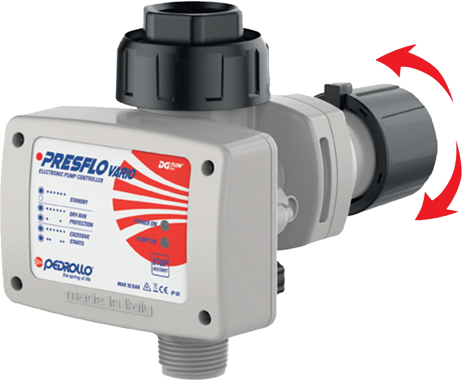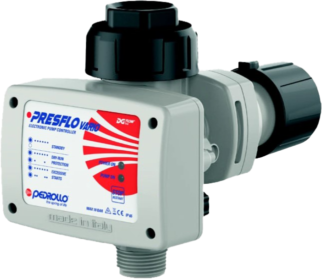 Pedrollo PRESFLO VARIO является электронным устройством для включения (при открытии крана) и остановки (при закрытии крана) однофазных электронасосов до 1.5 кВт с регулируемым давлением перезапуска в диапазоне от 0.8 до 2.4 бар. Микропроцессор регулятора давления защищает насос от работы всухую (в случае возобновления подачи воды происходит автоматическое включение насоса), обеспечивая автоматическую или ручную перезагрузку. Кроме того, данное устройство защищает электронасос от слишком частых перезапусков из-за небольших утечек воды в системе.
