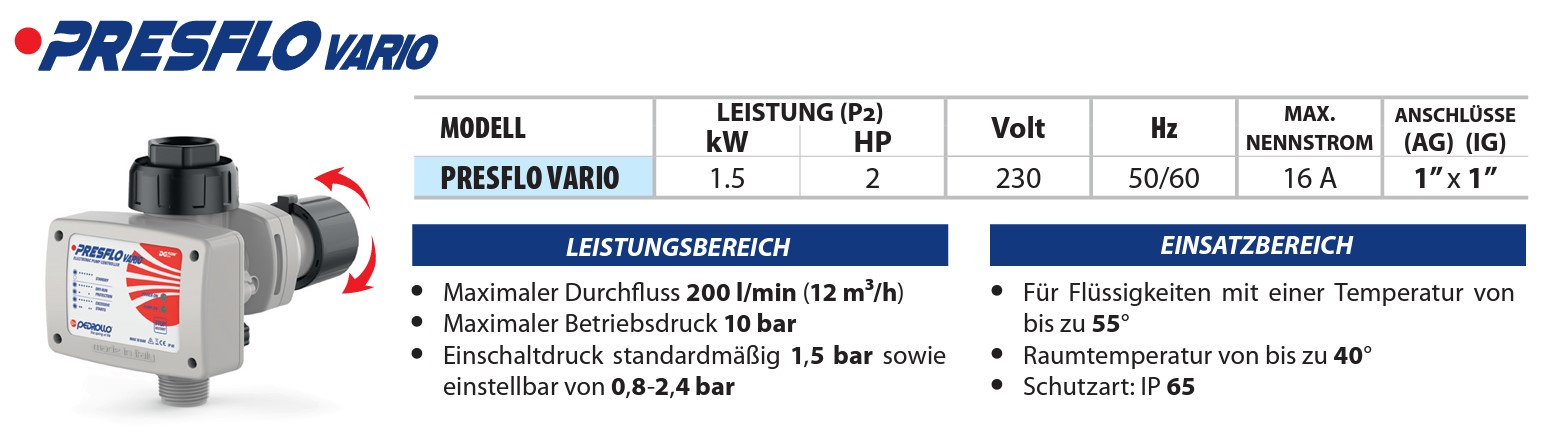 Cumpără Regulator electric de presiune PRESFLO VARIO (1.5 kW) Pedrollo Codul produsului:50064/200