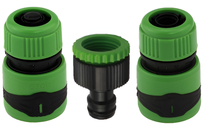 Комплект из 3-х соединителей для шланга: включает 5/8" соединитель для шланга с функцией остановки и покрытием TPR, 5/8" соединитель для шланга с покрытием TPR, 1/2"-3/4" адаптер для крана.