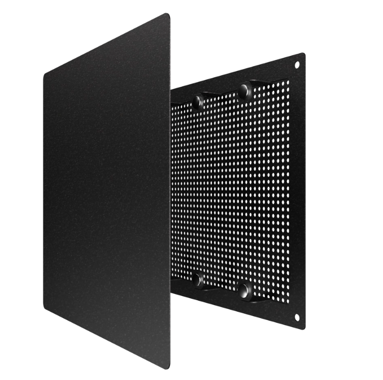 RVM состоит из двух частей. Рамка с сеткой и магнитами крепится к поверхности при помощи саморезов или клея, декоративная панель фиксируется на рамку с помощью магнитов, благодаря чему легко снимается для обслуживания решетки, скрывает вентиляционное отверстие и крепление рамки. За счет такой конструкции потоки воздуха распределяются равномерно.