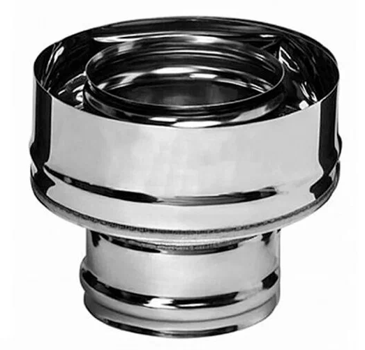 Адаптер (старт) выполнен в виде рюмки - своеобразный переход с одноконтурных дымоходов на двухконтурные сэндвич из нержавеющей стали. Рюмка исполняет роль заглушки для сэндвич дымоходов. Внутренний контур данного элемента выполнен из нержавеющей стали, толщиной 0.5 мм, наружный - из зеркальной нержавеющей стали - 0.5 мм. Адаптер стартовый служит для перехода от дымового патрубка печи к двухстенному дымоходу (сэндвичу). Многие, в целях экономии, покупают вместо стартового адаптера заглушку с отверстием. Это категорически не рекомендуется, так как адаптер не только является кожухом, который закрывает уплотнитель двухстенного дымохода, но и принимает на себя полностью вес двухстенной дымовой системы.