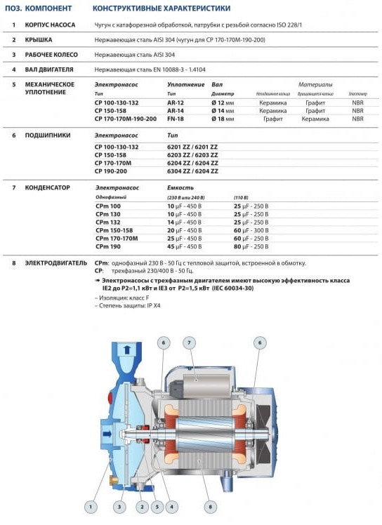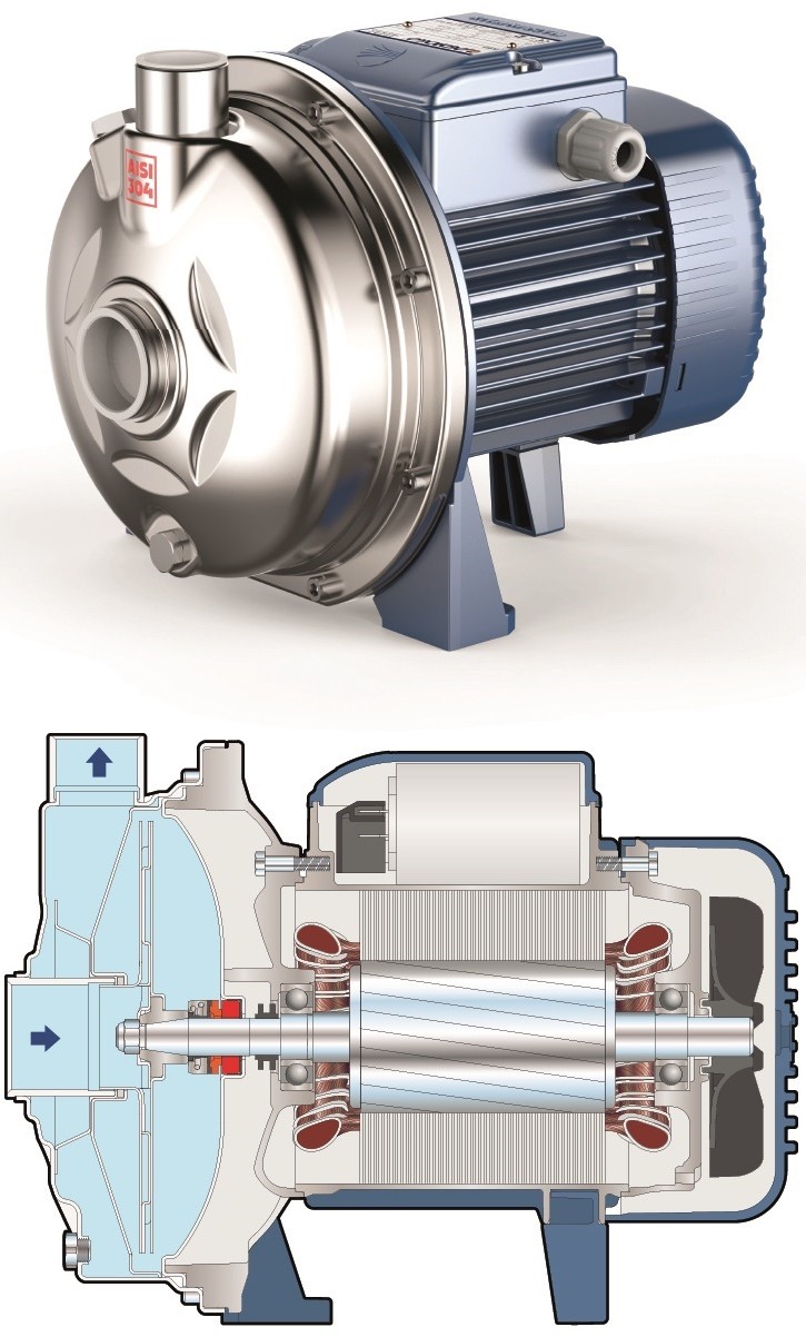 Серия СР включает в себя электронасосы центробежного типа с одним рабочим колесом, которые объединяет четкий дизайн и совершенно определенные конструктивные решения, обусловливающие их эксплуатационные характеристики. Рабочее колесо, качающееся на ведущем валу, находится прямо напротив всасывающего патрубка, размещенного на корпусе насоса. Структура рабочего колеса насоса Pedrollo обеспечивает при минимальных гидравлических потерях, радиальное движение жидкости по направлению от центра к периферии, в процессе которого радиальные лопасти, имеющиеся внутри канала рабочего колеса, передают энергию накачиваемой жидкости как в виде давления, так и в виде увеличения скорости потока. На выходе из рабочего колеса жидкость устремляется в спираль, которая, совместно с коническим диффузором, обеспечивает преобразование части кинетической энергий в энергию напора.