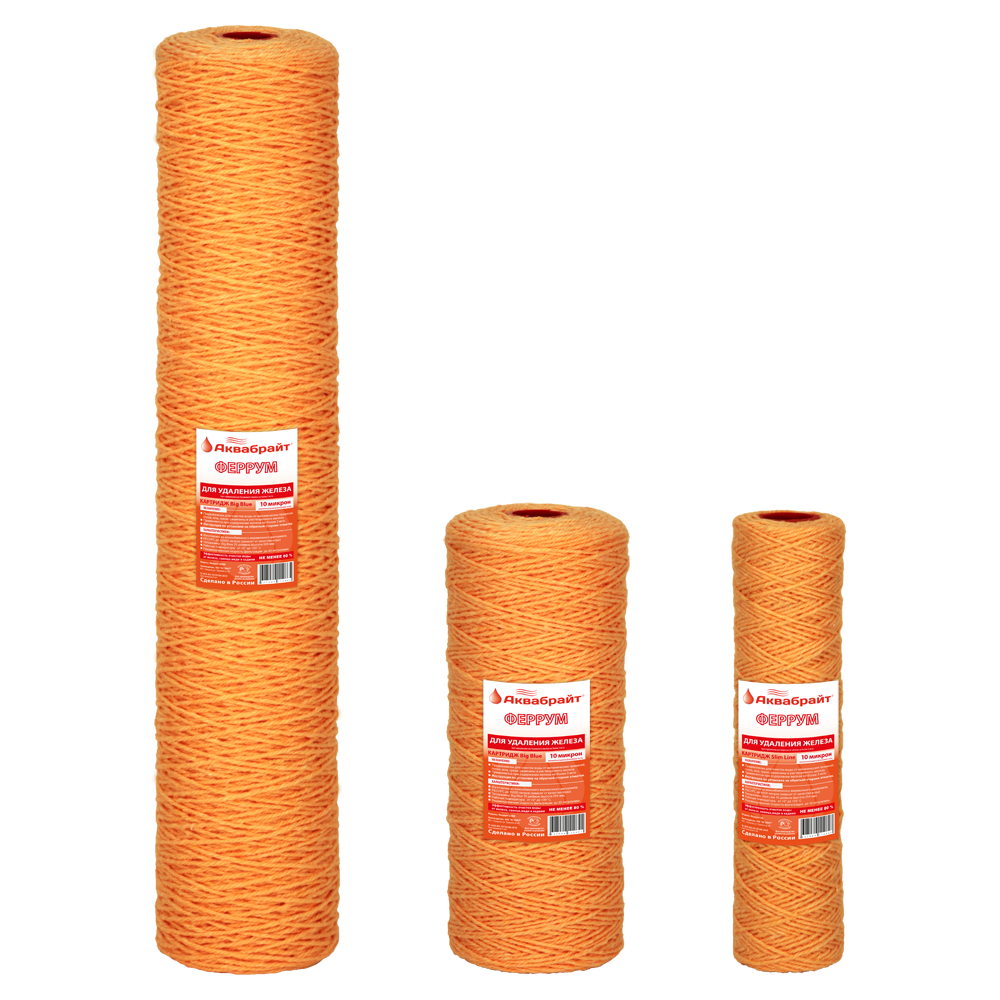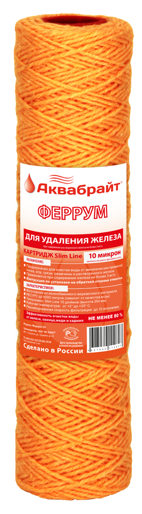 Картридж АКВАБРАЙТ ФЕРРУМ-10 изготовлен из ионообменного веревочного полипропилена с пищевым допуском.