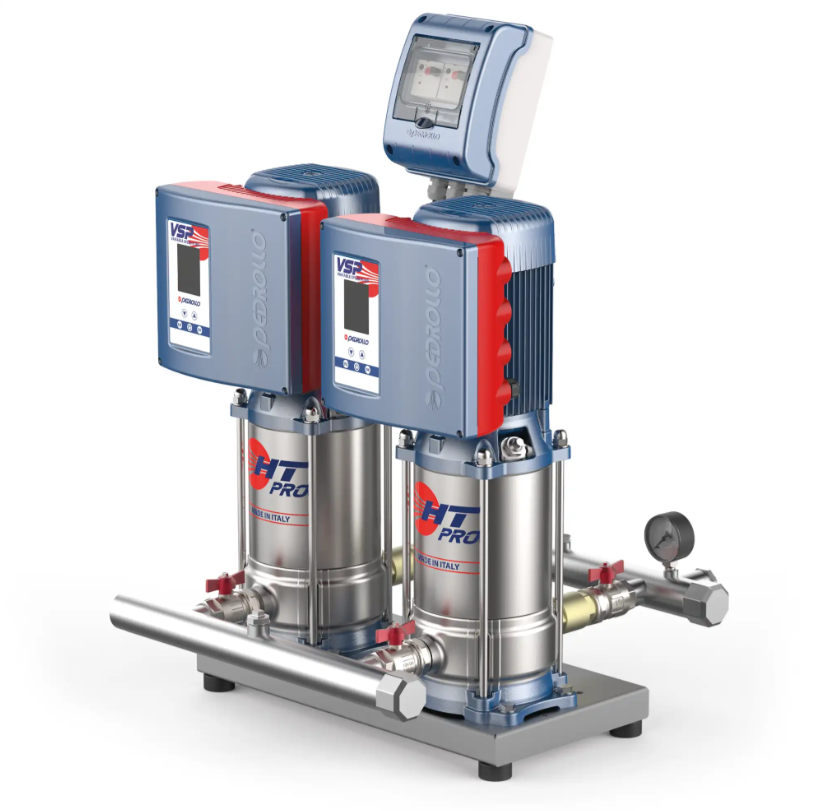 Двухнасосная станция повышения давления VSP2 – HT 3/4 PRO на базе двух вертикальных многоступенчатых насосов Pedrollo по 0,75 кВт, оснащённых встроенными инверторами. Предназначена для поддержания постоянного давления в системах водоснабжения частных домов, жилых комплексов, коммерческих и административных зданий. Оснащена интеллектуальной автоматикой, датчиком давления и электрической панелью управления. Насосы изготовлены из нержавеющей стали AISI 304, рабочие колеса — из материала Noryl.