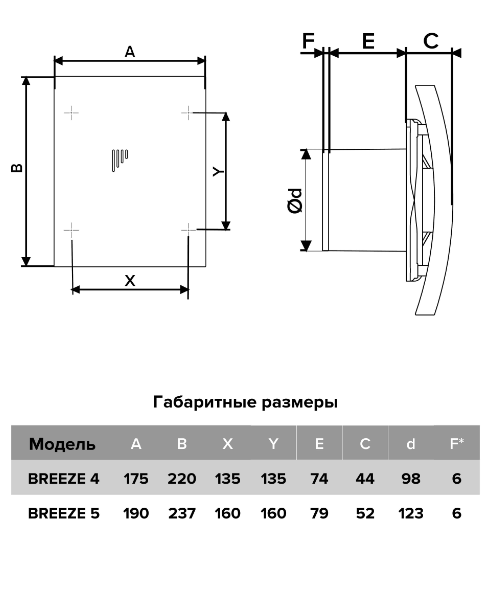 Вентилятор BREEZE 4C применяется для постоянной или периодической вытяжной вентиляции санузлов, душевых, кухонь и других бытовых помещений. Дизайнерская серия BREEZE имеет нестандартную форму и лаконичный дизайн с закрытой лицевой панелью, которую можно легко снять, чтобы помыть или просто убрать пыль с корпуса и крыльчатки. Модель оснащена обратным клапаном, который предотвращает проникновение неприятных запахов из шахты. Двигатель на шарикоподшипниках позволяет установить вентилятор как в стену, так и в потолок (при снятии обратного клапана). Монтаж осуществляется с помощью саморезов, которые входят в комплект.