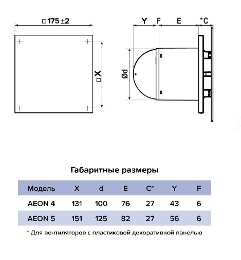 Декоративная панель из пластика подходит для всех моделей вентиляторов AEON. Стильная декоративная накладная панель позволяет интегрировать AEON в любой интерьер и обновлять его при желании, выбирая цвет панели из разнообразия вариантов. Для установки декоративной панели необходимо повернуть ее на 45°, затем прижать к лицевой панели вентилятора и еще раз повернуть на 45° по часовой стрелке. Таким образом декоративная панель будет надежно зафиксирована. В случае установки вентилятора в потолок необходимо закрепить лицевую панель снизу на корпусе саморезом (входит в комплект).