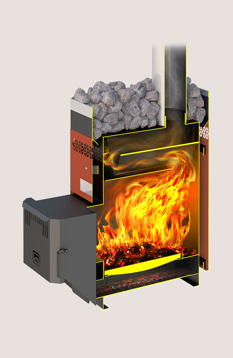 Особая конструкция нагревательных поверхностей обеспечивает умеренный нагрев парной до 90°С, в сочетании с отличным прогревом большой массы камней позволяет получить настоящую печь для русской бани.