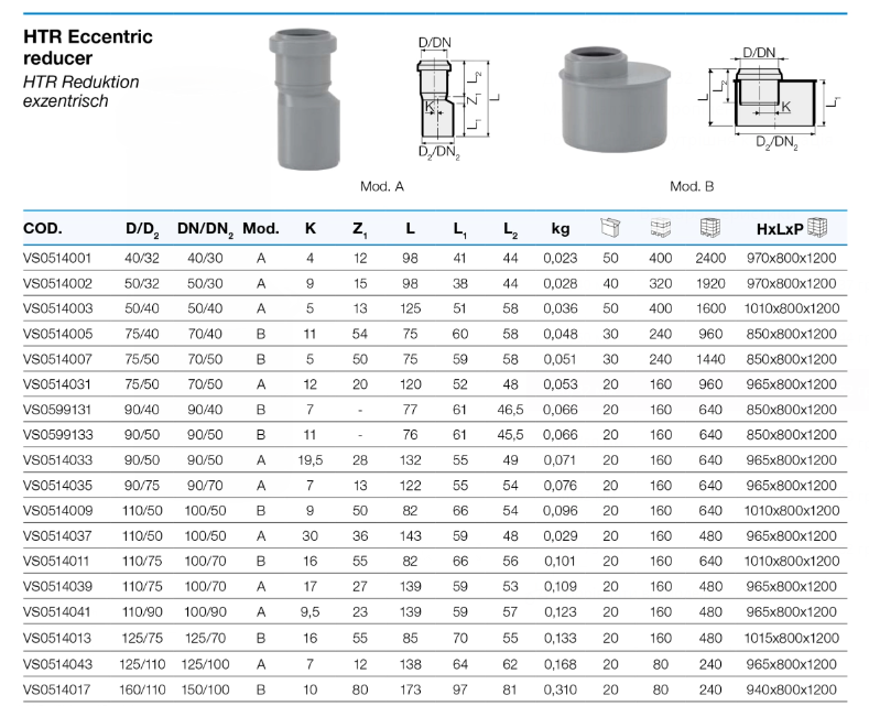 Купить Переход эксцентрический уменьшающий 110/40 HTR Valsir Код товара:VS0514008