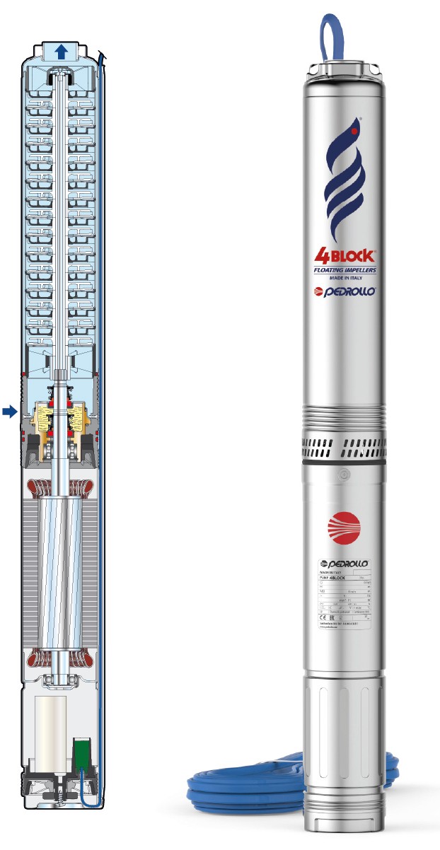 Фирма PEDROLLO предлагает на рынке электронасосов для 4-дюймовых скважин модель 4BLOCK, которая является одним из лидеров рынка по эксплуатационным характеристикам и в частности по стойкости к песку, которая гарантируется до 150 г/м3. Электронасос предназначен для эксплуатации в быту для подъема воды с содержанием песка до 150 г/м3. Моноблочный скважинный 4-дюймовый электронасос создан в качестве нового, более экономичного и надежного изделия. Насос поставляются в комплекте с конденсатором внутри двигателя и кабелем электропитания длиной 20 м, что облегчает и упрощает установку.