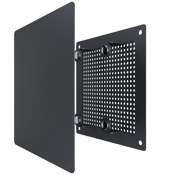 RVM состоит из двух частей. Рамка с сеткой и магнитами крепится к поверхности при помощи саморезов или клея, декоративная панель фиксируется на рамку с помощью магнитов, благодаря чему легко снимается для обслуживания решетки, скрывает вентиляционное отверстие и крепление рамки. За счет такой конструкции доступ воздуха в шахту не перекрывается и происходит его равномерное распределение.