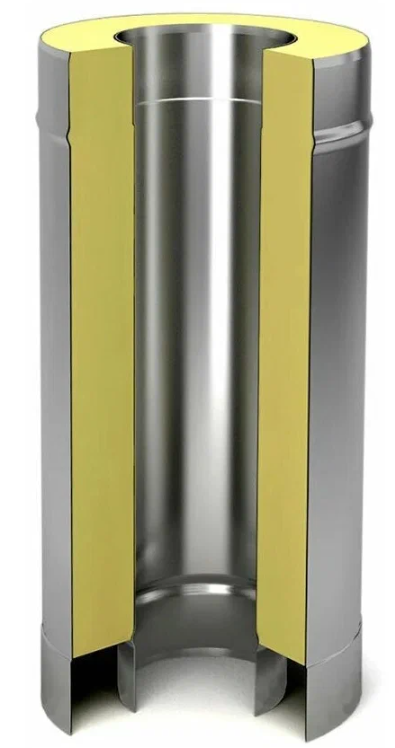 Двустенный дымоход или сэндвич представляет собой конструкцию, которая состоит из двух наделенных разными диаметрами труб (внешней и внутренней). Пространство между этими трубами наполнено теплоизоляционным материалом негорючего свойства из базальтового волокна высокого качества. За счет такой конструкции происходит быстрый нагрев внутренней трубы, что впоследствии дает возможность за короткий промежуток времени после старта поднять температуру в дымоходе выше «точки росы», тем самым избежав образования конденсата.