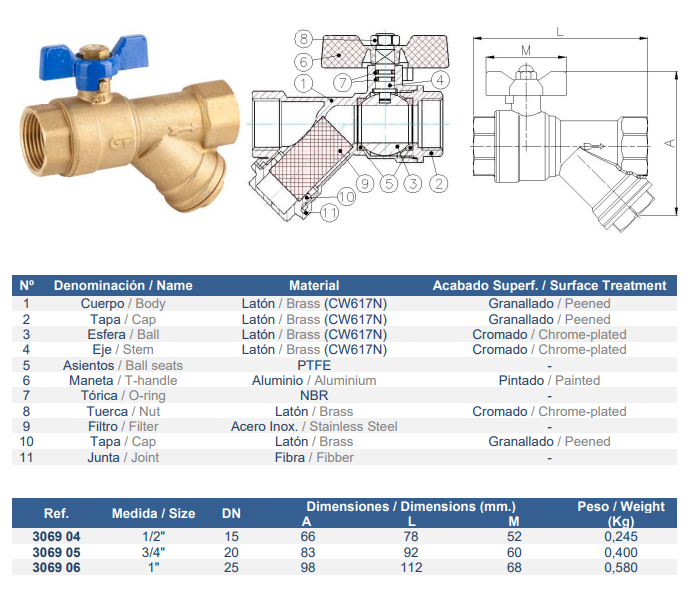 Купить Шаровый кран бабочка 1/2' FF с фильтром 'Y' Genebre Код товара:3069 04