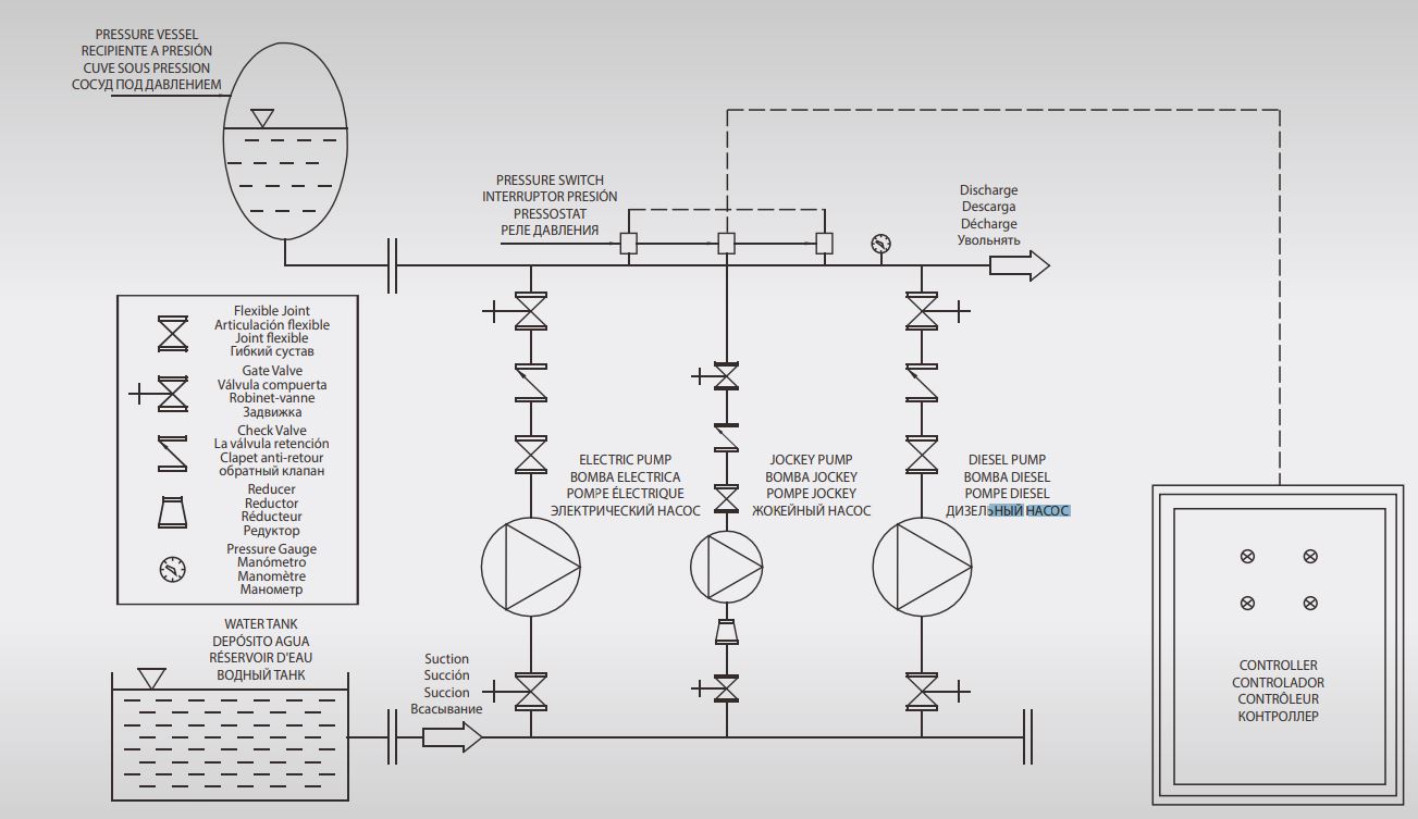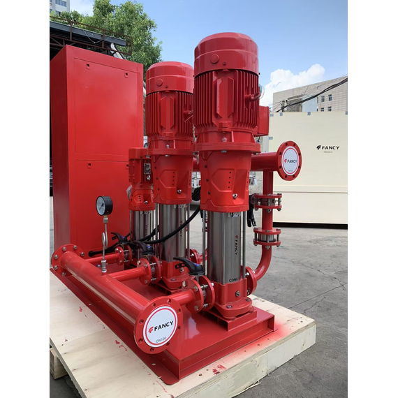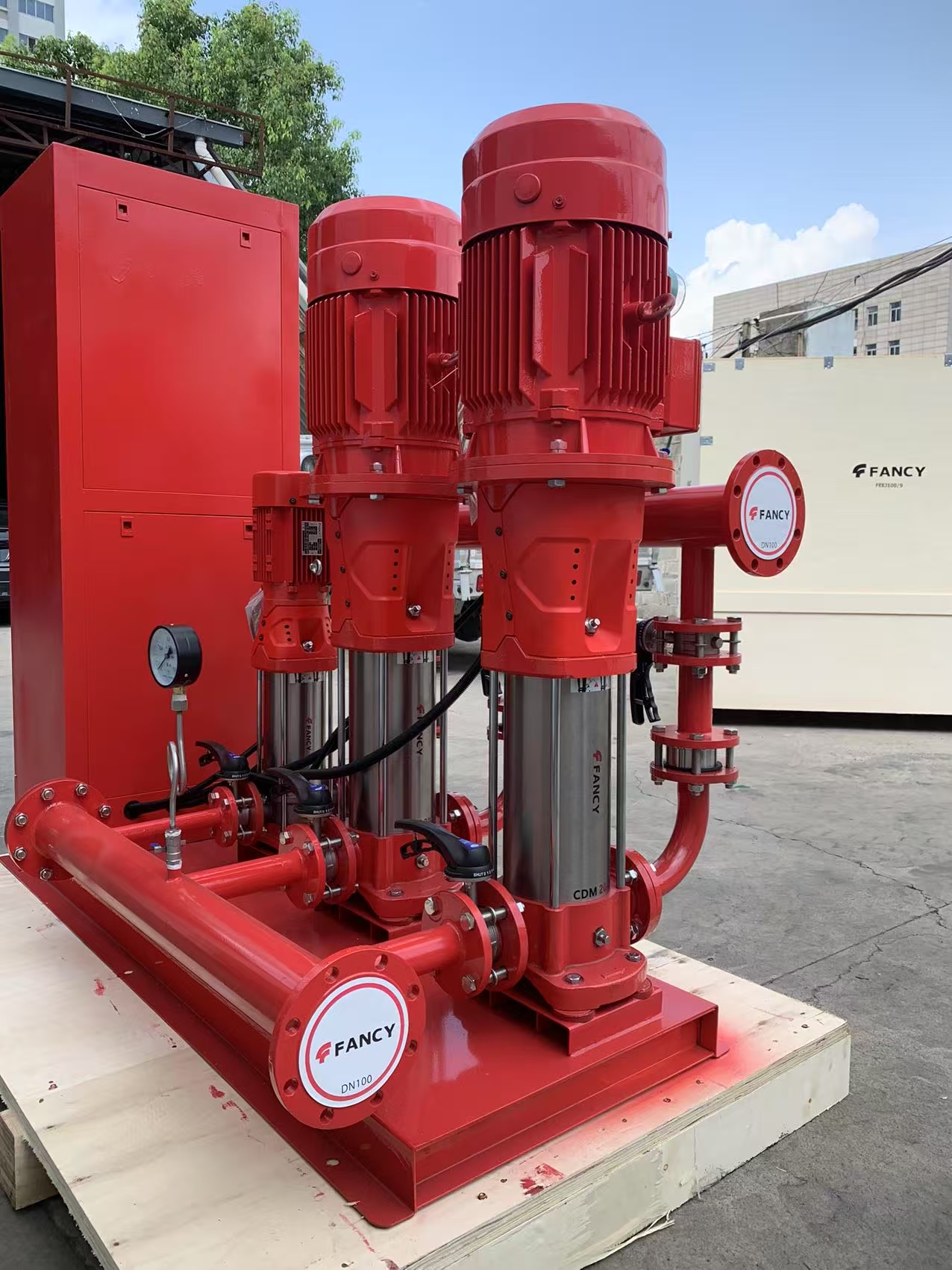Оснащена двумя основными электрическими насосами CDM20-8 (11 кВт) и поддерживающим насосом Jockey CDMF3-15 (1,5 кВт). Система предназначена для надежного и долговечного водоснабжения противопожарных установок. Конструкция выполнена на прочной стальной раме, с индивидуальными линиями контроля давления, обратными и запорными клапанами. Соответствует международным требованиям NFPA, обеспечивает автоматический запуск основного насоса при падении давления ниже заданного уровня.