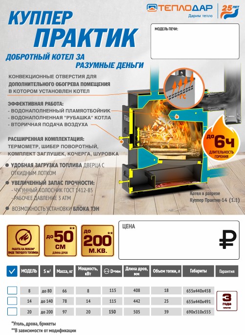 «Куппер ПРАКТИК» - экономичная линейка надежных твердотопливных отопительных котлов для отопления жилых домов и других помещений площадью до 200 м².