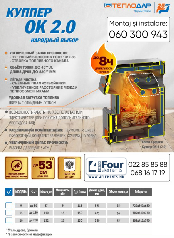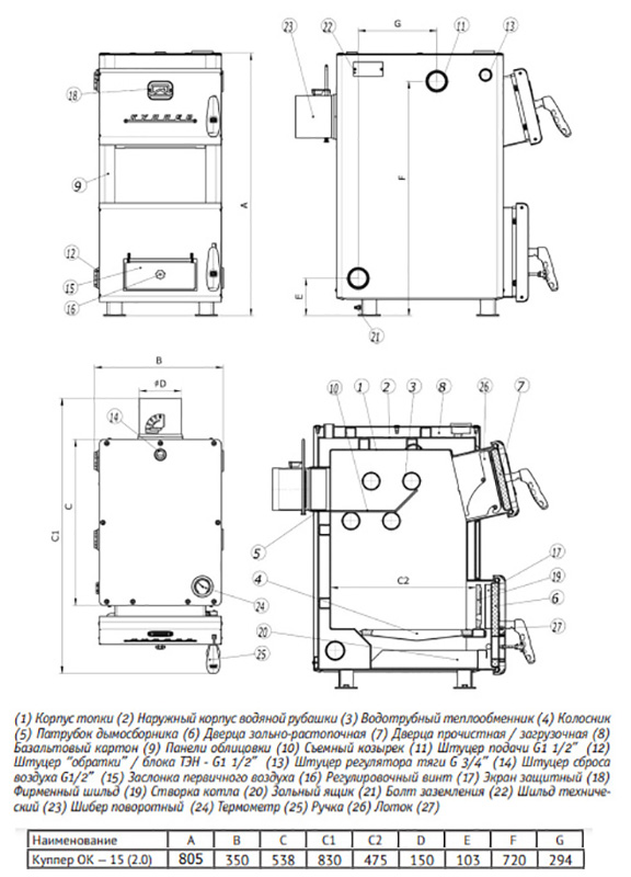 В базовую комплектацию котла «Куппер ОК 2.0» входит: кочерга, шуровка, термометр, поворотный шибер.