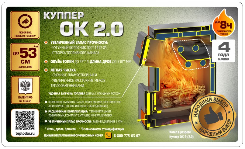 «Куппер ОК 2.0» - это универсальные твердотопливные котлы в компактном исполнении, которые позволяют не только отапливать помещения площадью от 50 до 180 м2, но и разогревать или приготовить обед на чугунной плите.