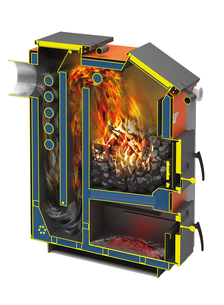 Время горения на одной закладке угля - до 24 часов. Такая длительность достигнута благодаря объему топки, верхнему горению топлива в котле, развитому теплообменнику и трехзонной подаче воздуха.