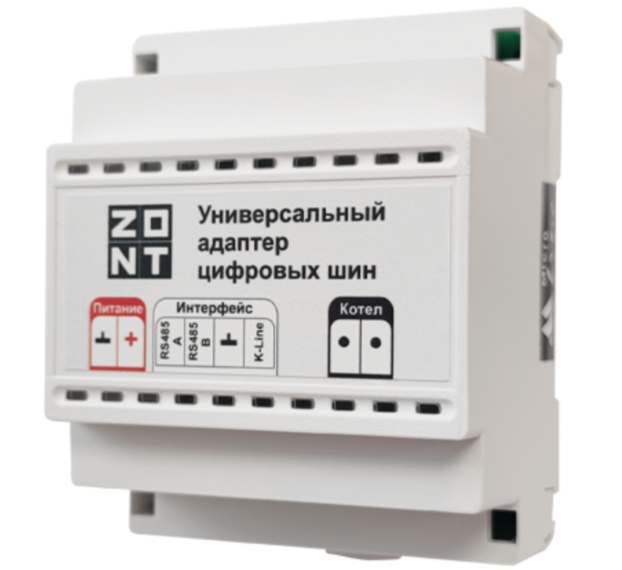 Универсальный адаптер цифровых шин предназначен для подключения термостатов и контроллеров ZONT к газовым и электрическим котлам, работающим по цифровым протоколам OpenTherm, E-BUS, BridgeNet (Ariston), BSB, Navien, Navien Deluxe One, Wolf, Kiturami – проверить наличие шины в конкретной модели котла можно в Совместимости котлов с ZONT.