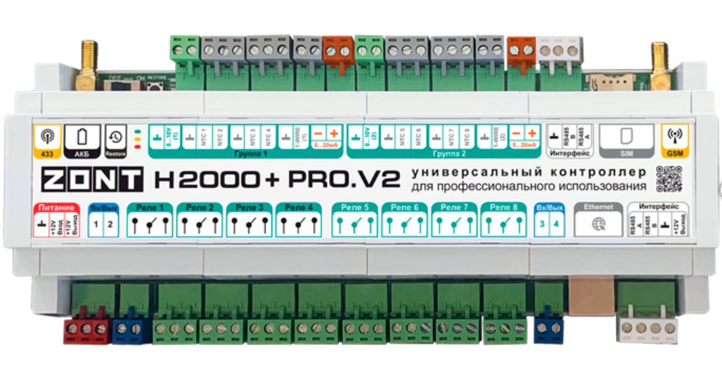 Универсальный контроллер ZONT H2000+ PRO.V2 — обновленная версия контроллера H2000+ PRO. Он обладает возможностями гибкого программирования для решения задач автоматизации и подходит для контроля и управления сложными системами отопления.