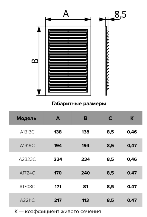 Для декоративного оформления выходов приточных или вытяжных вентиляционных систем бытовых, общественных и промышленных зданий. Для настенного или потолочного монтажа. Одноэлементная конструкция. Решетки имеют наклонные жалюзи. С защитной сеткой.