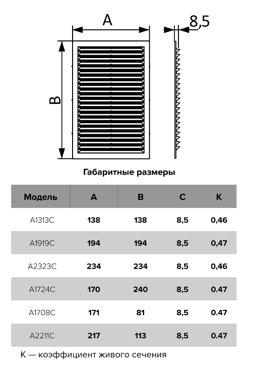 Для декоративного оформления выходов приточных или вытяжных вентиляционных систем бытовых, общественных и промышленных зданий. Для настенного или потолочного монтажа. Одноэлементная конструкция. Решетки имеют наклонные жалюзи.