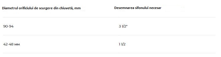 Mai jos este un tabel care arata diametrele orificiului de scurgere si tipul corespunzator de sifon: